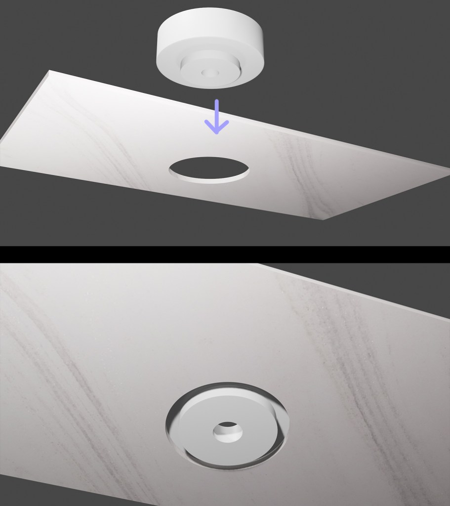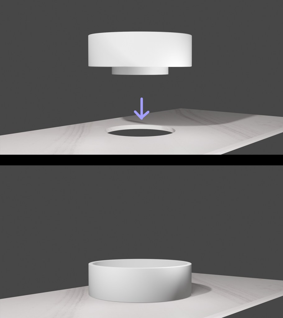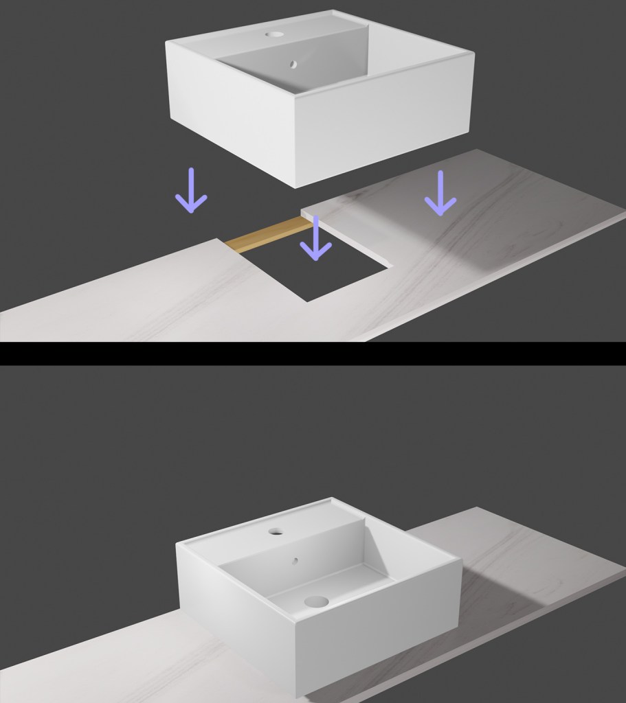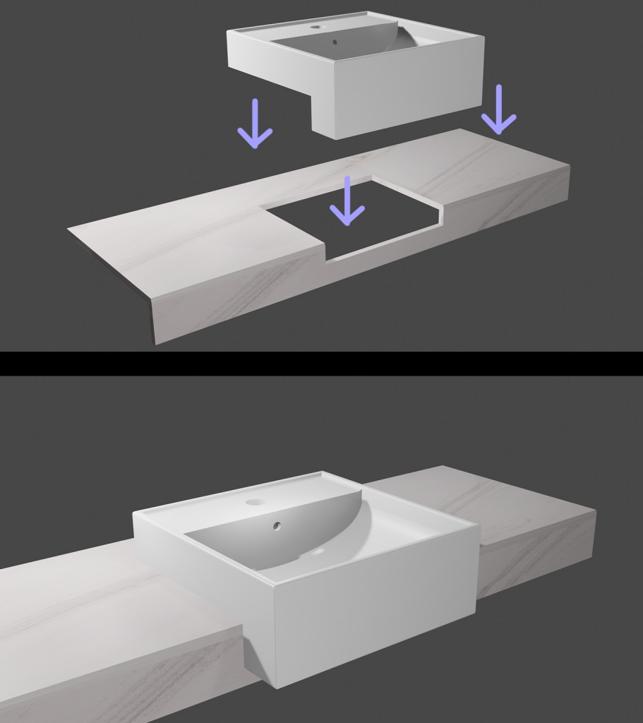 依照下嵌盆型狀;如橢圓型、圓角方型,製作好模具,生產出來的洗手台面有槽盆孔,