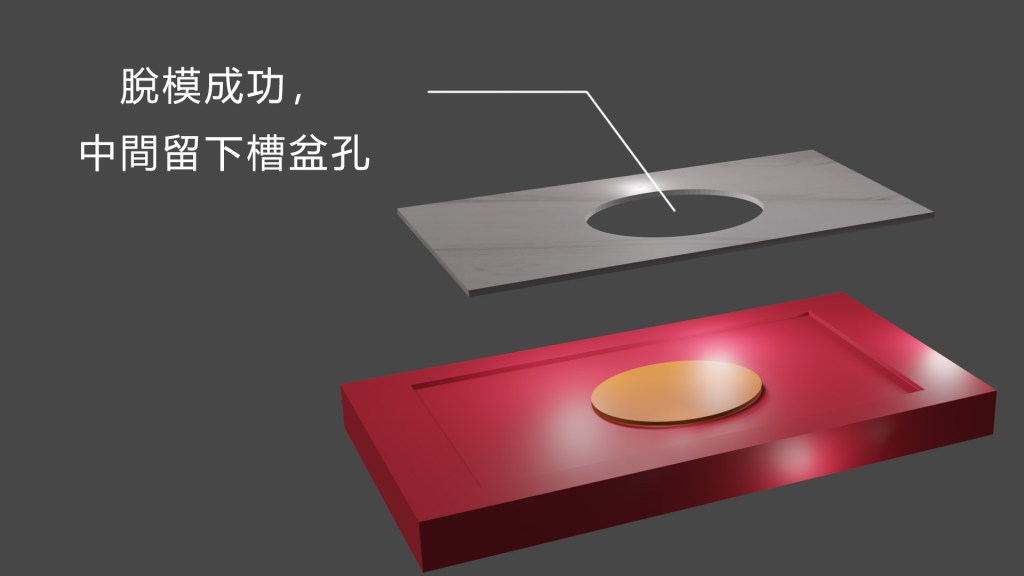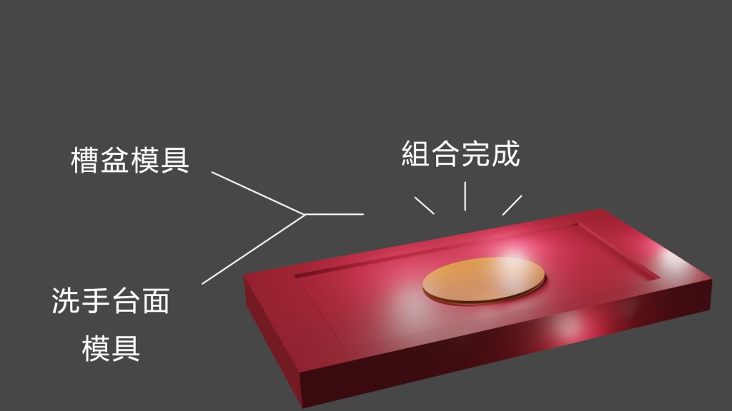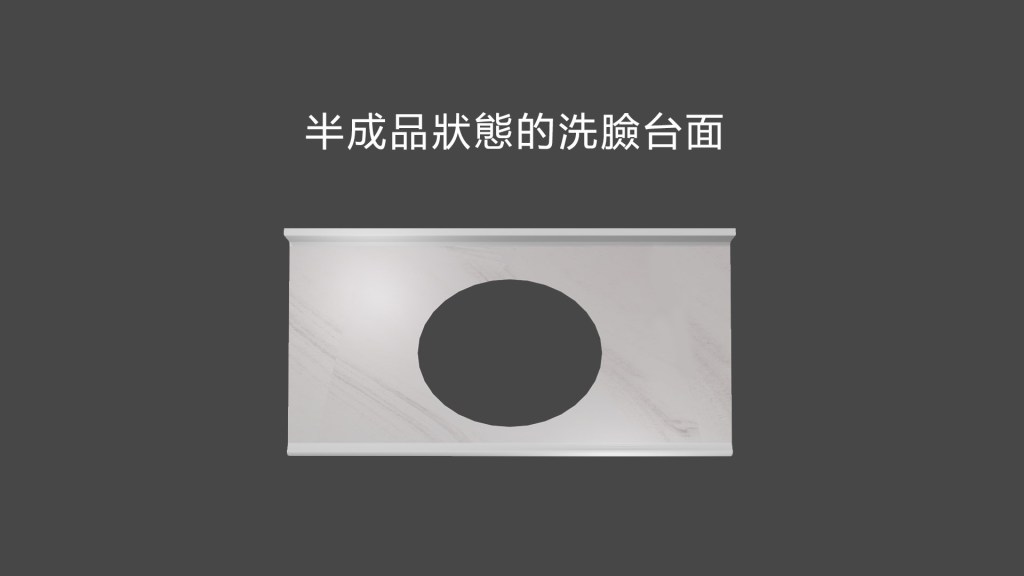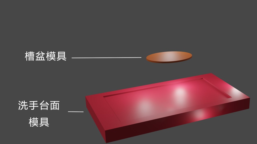 依照下嵌盆型狀;如橢圓型、圓角方型,製作好模具,生產出來的洗手台面有槽盆孔,