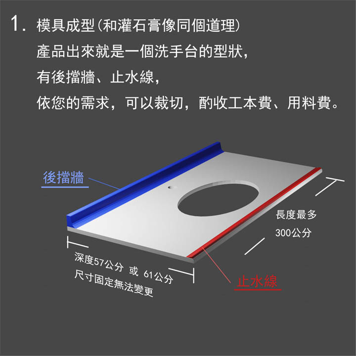 如圖1. 灌注好的台面,深度固定57公分或61公分,但是;可以裁切加工改變尺寸。