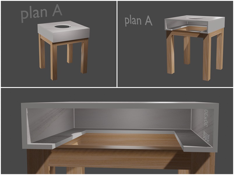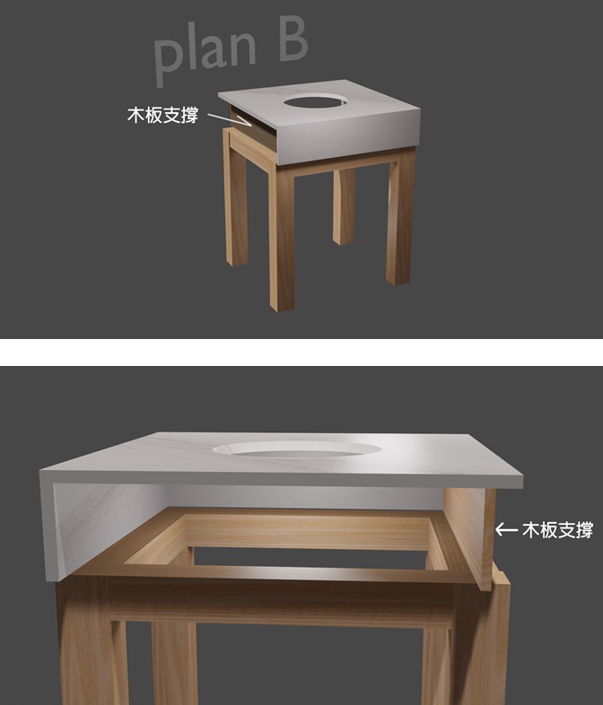 planB (方案B) 靠牆壁的一側,台面下方;用木板支撐台面,視情況;木板可替換為人造石材質,此方案用料較省,但下方沒有[ㄇ型]結構。