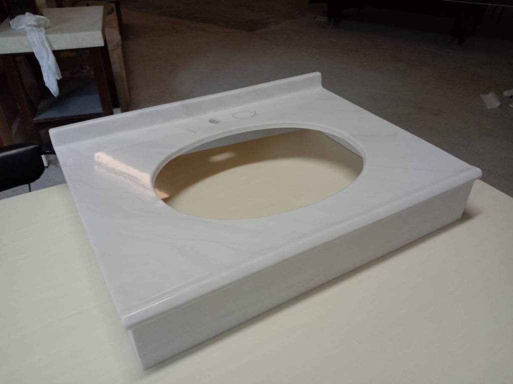 經過加工,有「水龍頭孔洞」、「下檔水板」的洗手台面,之後還要進行修補、拋光打蠟。