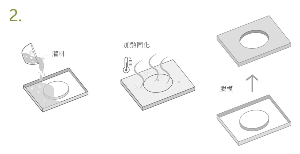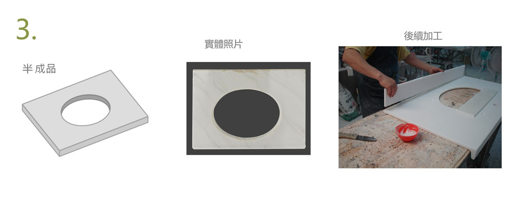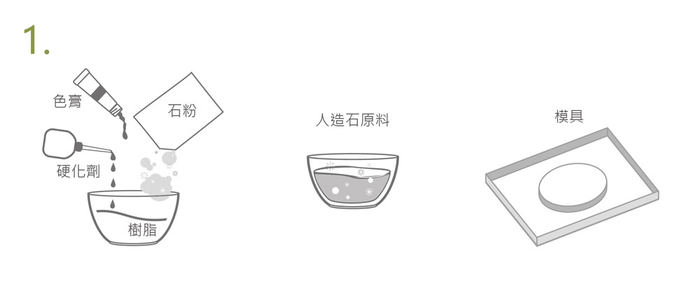 將「人造石原料」,倒入「模具」,加熱固化,然後脫模,可得「半成品」。