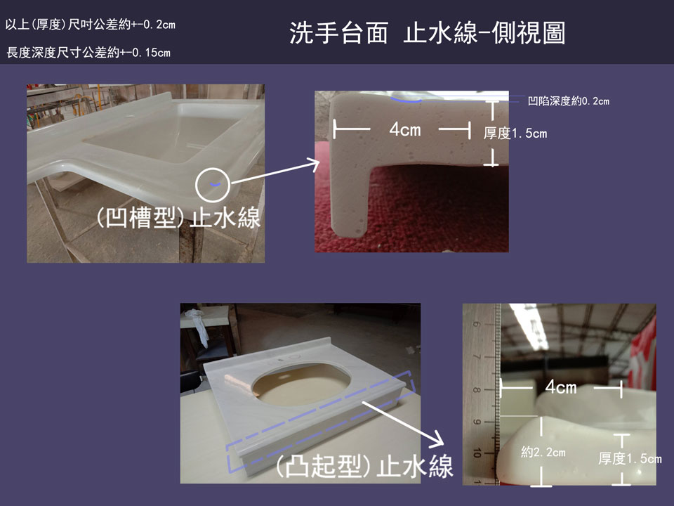 1-2.止水線 止水線,又稱為止水槽、止水溝、止水檻,可防止積水低落 點擊此處回到首頁 1-1.整座洗手台的組成是… …?———-點擊到頁面 1-2.止水線———-點擊到頁面 1-3.擋水板(後擋牆)———-點擊到頁面 1-4.擋水板(前左右貼邊,假厚)———-點擊到頁面 1-5.洗手台-台面-槽盆選搭———-點擊到頁面 分享此文: 按一下即可分享至 X(在新視窗中開啟) X 按一下以分享至 Facebook(在新視窗中開啟) Facebook 喜歡 正在載入...